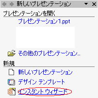 「新規作成」ダイアログが表示されるので、「プレゼンテーション」タグのインスタントウィザード.pwzを選ぶ。