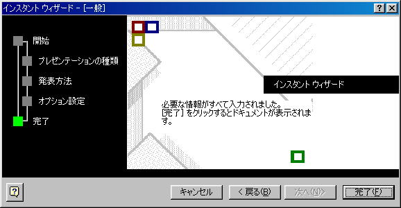 インスタントウィザードとはいくつかの質問に答えるだけで、プレゼンテーションのひながたを作成する機能です。
